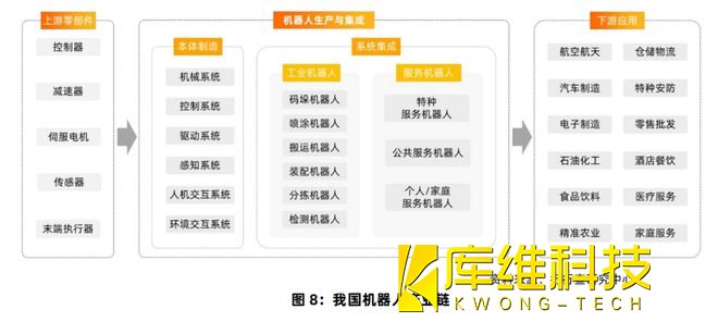 機(jī)器人產(chǎn)業(yè)鏈主要分為上游核心零部件研發(fā)與生產(chǎn)、中游本體制造和系統(tǒng)集成,以及下游各行各業(yè)的具體應(yīng)用等三方面: