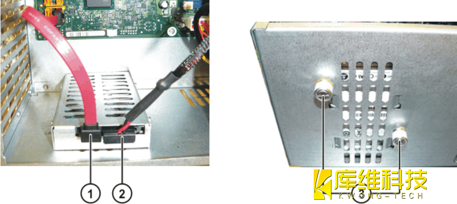 存儲盤劃分為三個分區,其中第三個分區屬于隱藏的恢復分區。該分區可通過庫卡恢復工具來讀寫。第一 分區與 C 盤對應,而第二分區則與 D 盤對應。數據線通過 SATA 插頭與主板連接。