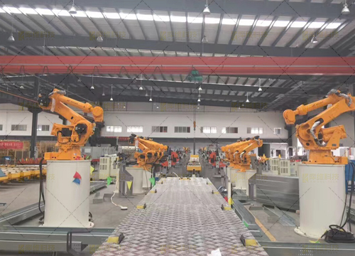 整線由彎板切割機器人工作站、中板坡口機器人工作站、座體機器人焊接工作站、中部槽機器人焊接工作站及中部槽總成機器人焊接線組成,包含整套機器人系統(tǒng)、機器人滑道、桁架梁、機器人焊接系統(tǒng)、兩軸變位機、彎板切割機、火焰割炬、激光跟蹤系統(tǒng)、焊接平臺、柔性組對工裝夾具、焊接電源、煙塵凈化系統(tǒng)等部分構(gòu)成