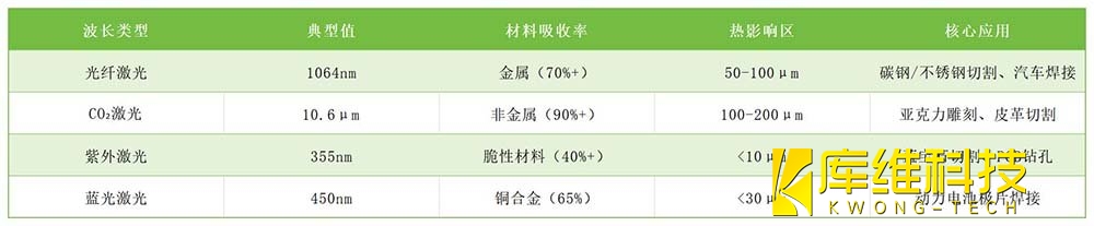 激光波長(單位:nm/μm)決定光子能量與材料吸收特性: