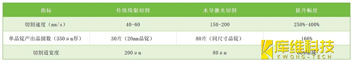 盡管水導激光切割速度優勢顯著,其進一步優化仍受限于激光波長適配性。目前技術主要支持1064nm(紅外)、532nm(綠光)及355nm(紫外)三種波長,而水對不同波長激光的吸收率差異(如1064nm吸收率約0.1%/cm,532nm增至約2%/cm)直接影響能量傳輸效率。國內企業如庫維科技正研發多頻段激光耦合技術,計劃擴展至266nm(深紫外)波段,以提升對12英寸晶錠的切割能力。