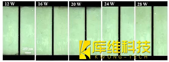 針對LTCC基板,采用波長532 nm的納秒激光,功率12-28 W,水射流速度180 m/s。加工結果顯示: